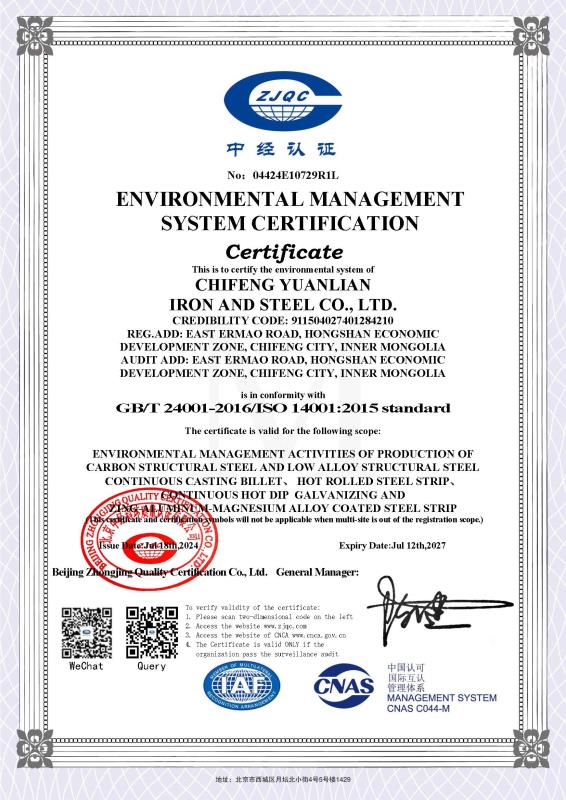 環(huán)境管理體系認證證書